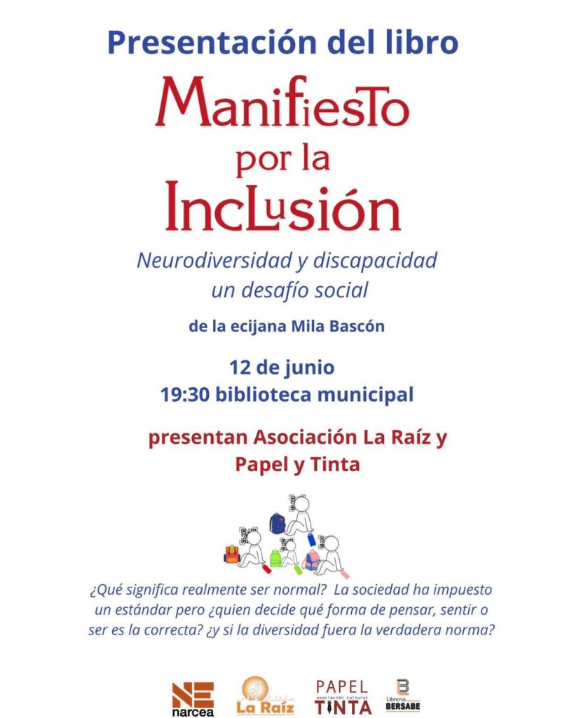 El próximo 12 de junio a las 19:30 h, la biblioteca municipal de Écija acogerá la presentación del libro Manifiesto por la Inclusión, escrito por la ecijana Mila Bascón. Este evento es una invitación a reflexionar sobre la neurodiversidad, la discapacidad y el gran reto social que supone construir un mundo más justo y accesible para todas las personas.