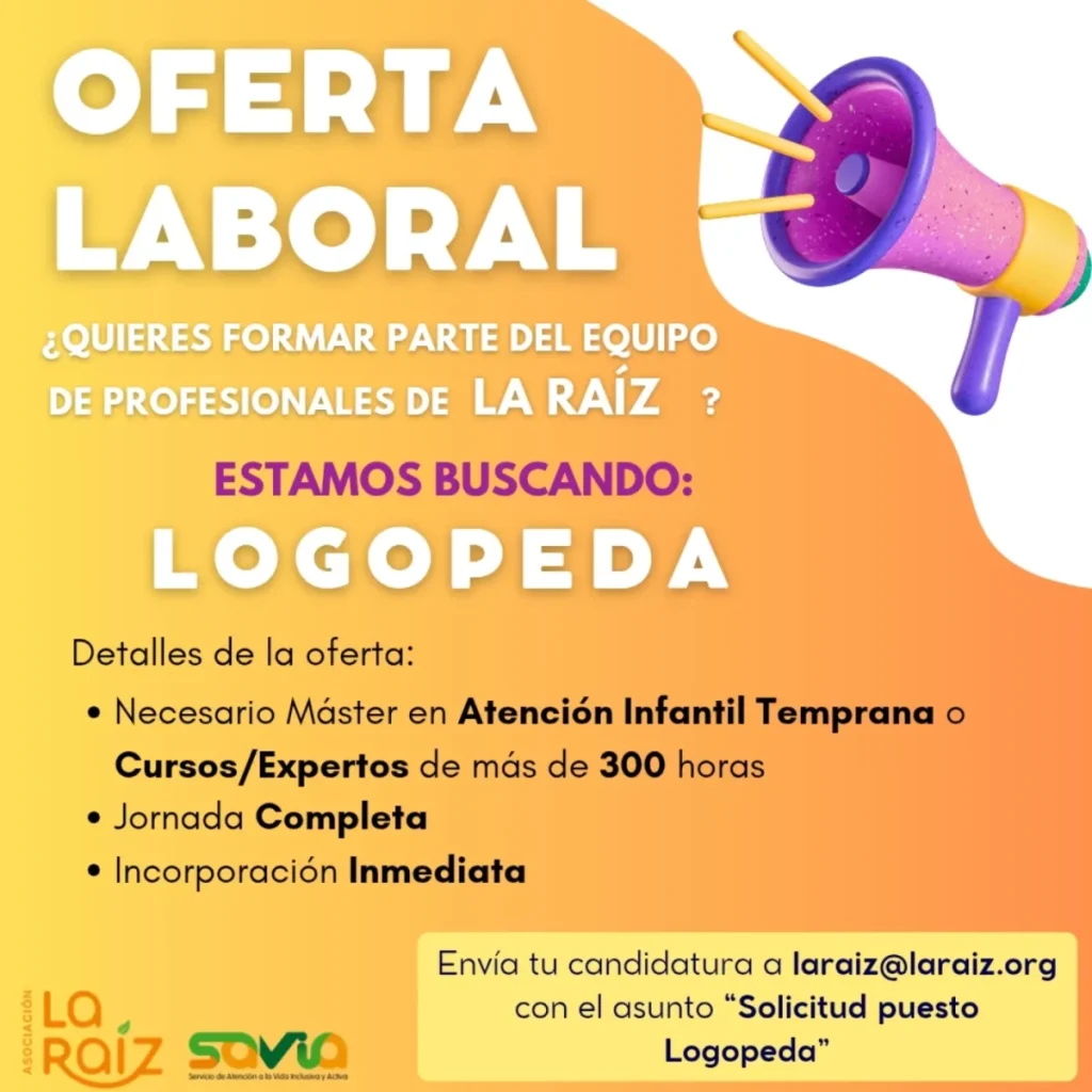 La Asociación La Raíz abre un proceso de selección de personal para la contratación de un/a Logopeda con formación específica en Atención Temprana. Buscamos a un profesional comprometido que quiera formar parte de nuestro equipo multidisciplinar para mejorar la calidad de vida de los más pequeños.